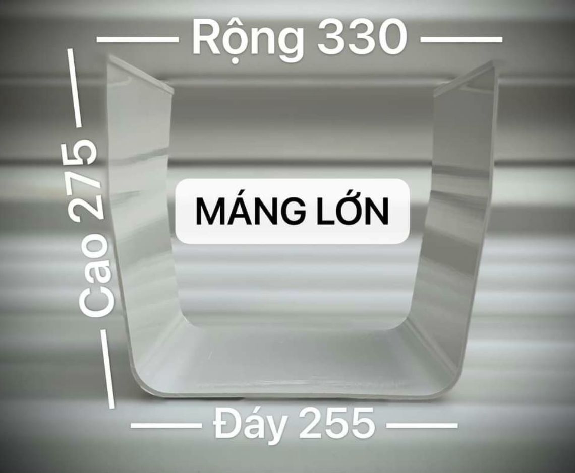 Máng xối size lớn phù hợp cho các công trình lớn, nhà xưởng công nghiệp và khu vực có nhu cầu thoát nước cơ lớn. Kích thước: Rộng 330mm, Cao 275mm, Đáy 255mm. Loại máng xối này có sức chứa lớn nên đáp ứng được lượng nước thoát lớn, giúp hạn chế tình trạng tràn nước mưa ra ngoài..