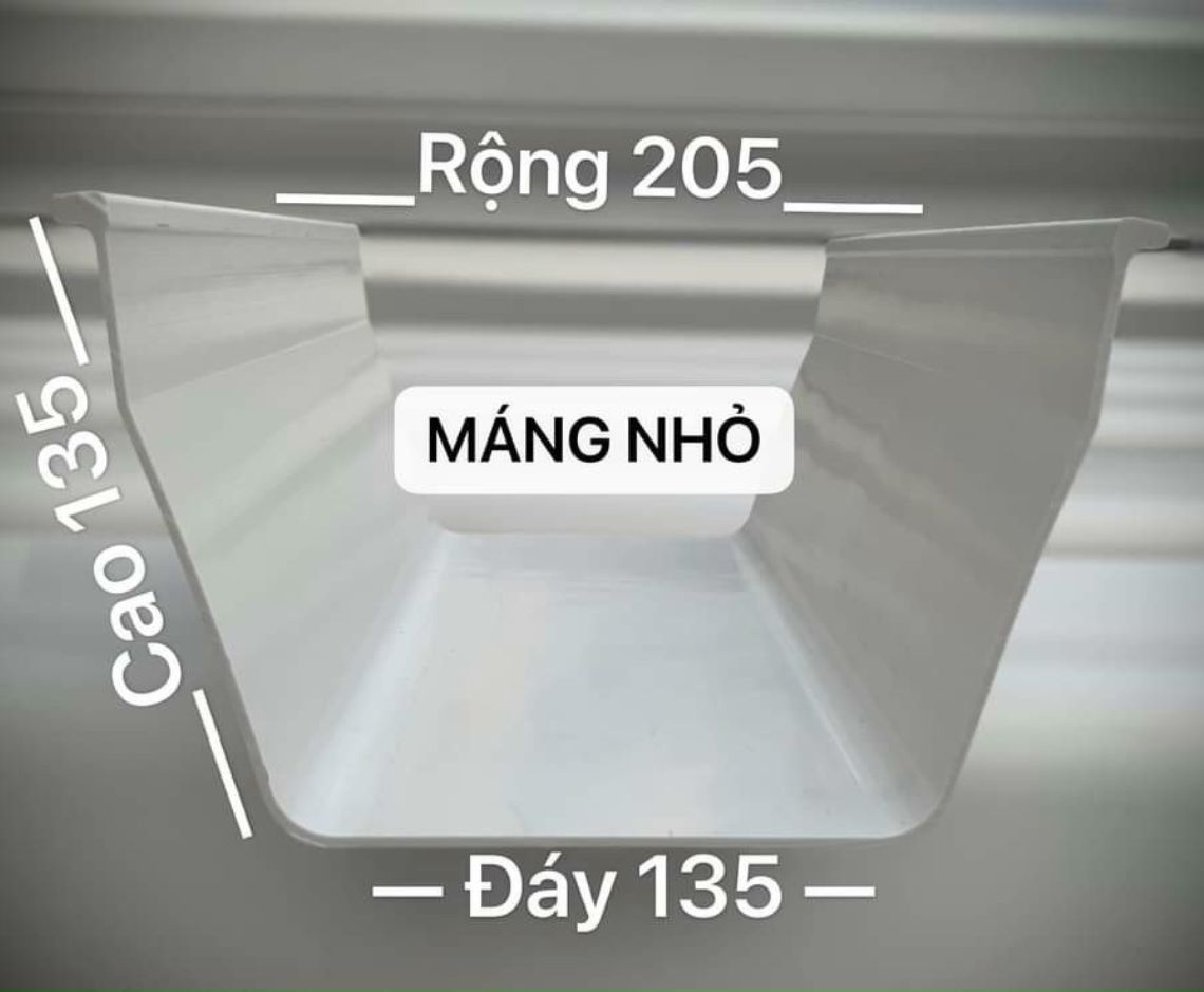 Máng xối size nhỏ là lựa chọn hoàn hảo cho các công trình nhỏ và khu vực có mức độ thoát nước không lớn. Kích thước: Rộng 205mm, Cao 135mm, Đáy 135mm. Loại máng xối này thường được sử dụng cho các nhà cấp 4 và công trình nhỏ.