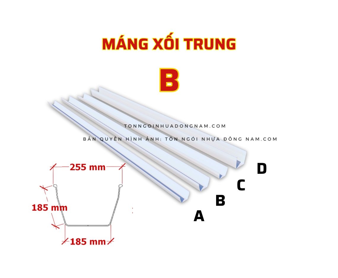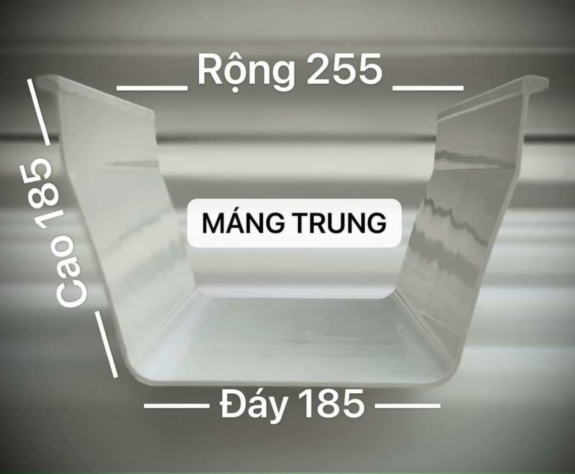 Máng xối size trung có kích thước Rộng 255mm, Cao 185mm, Đáy 185mm. Loại này phù hợp với các khu vực có lượng nước thóat trung bình. Thiết kế đơn giản và đảm bảo tính thẩm mỹ, độ bền cao.